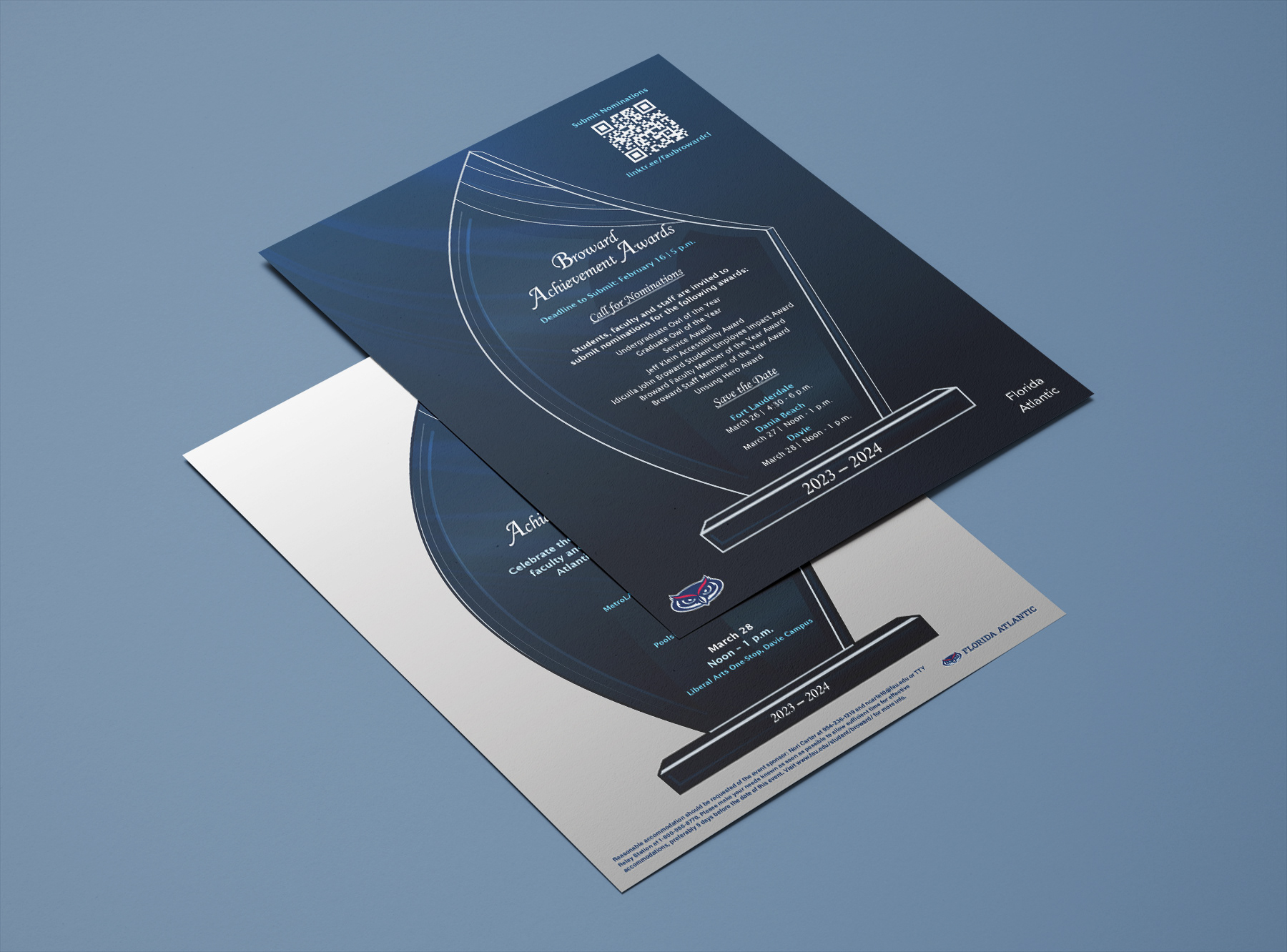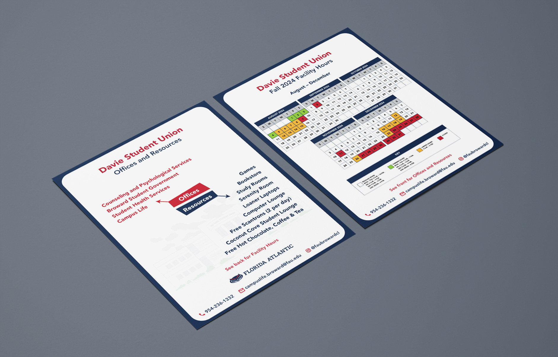 Graphics and collateral created for Florida Atlantic University Broward Campus Life, adhering closely to FAU's branding guidelines and developed in collaboration with campus life professional staff. Each request came from various staff members with unique visual preferences, resulting in a customized approach for each project. Timelines varied from a few days to several weeks depending on deadlines, with each graphic undergoing multiple rounds of critique to ensure design refinement, accuracy in spelling, and brand consistency. Managed by Director Nori Carter. Marketing flyers: 8.5 x 11 in. | Calendars: 11 x 17 in.